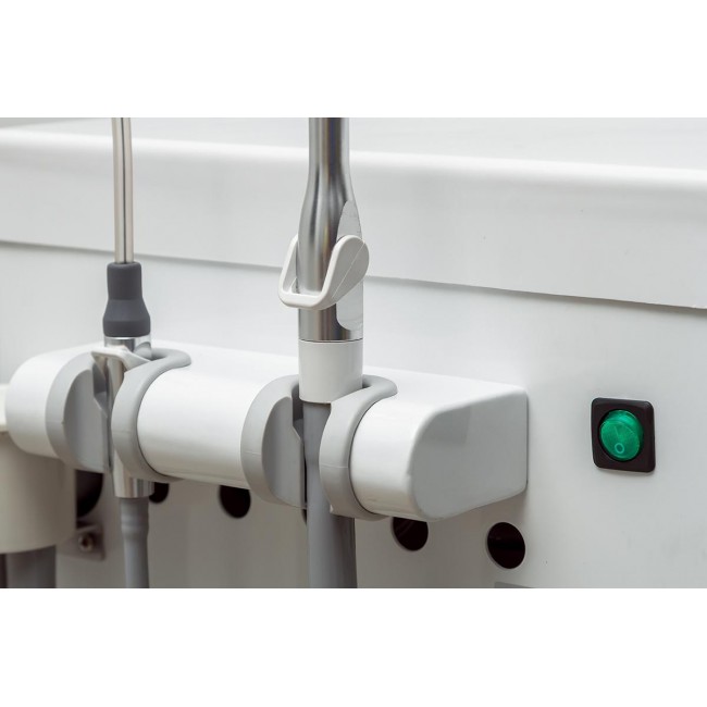 Стоматологический аспиратор состоит из наконечников сильного и слабого слюноотсоса, шлангов, металлического корпуса с пластиковыми колесами, встроенной помпы, керамической плевательницы, резервуара.