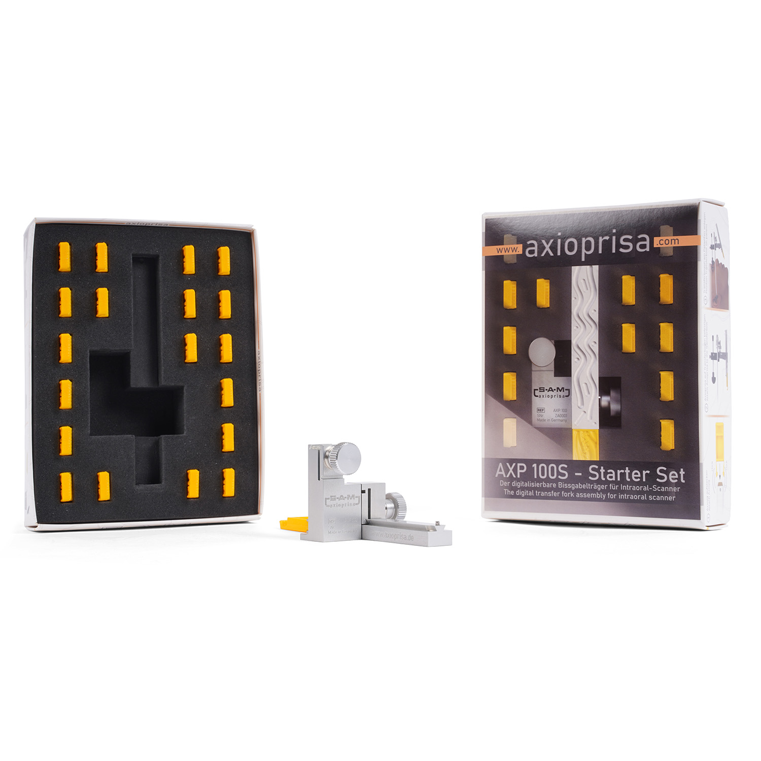 Сборка переноса Axioprisa прикреплена к переносной дуге SAM обычным способом. Благодаря комбинации Axioprisa и переносной дуги можно сканировать верхнюю челюсть в правильном анатомическом положении. Франкфуртская горизонталь — это плоскость, используемая всеми артикуляторами SAM. Используя этот путь, можно переносить положение челюсти с дополнительным сканированием во время внутриротового сканирования. Путь к простым процессам в стоматологической практике позволяет свести источники ошибок к минимуму.