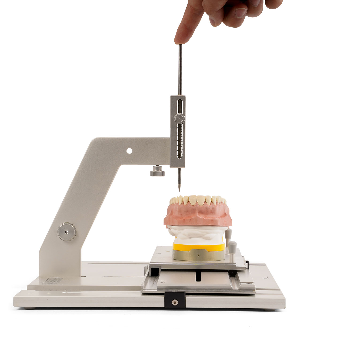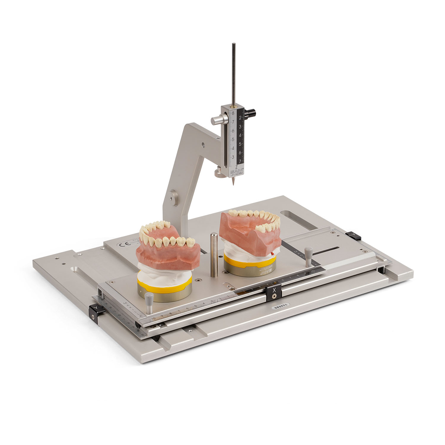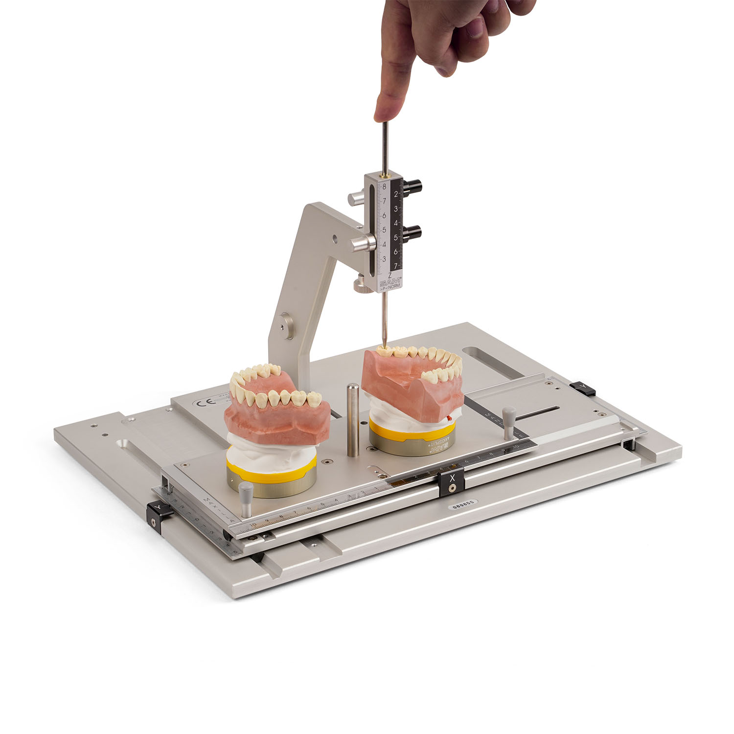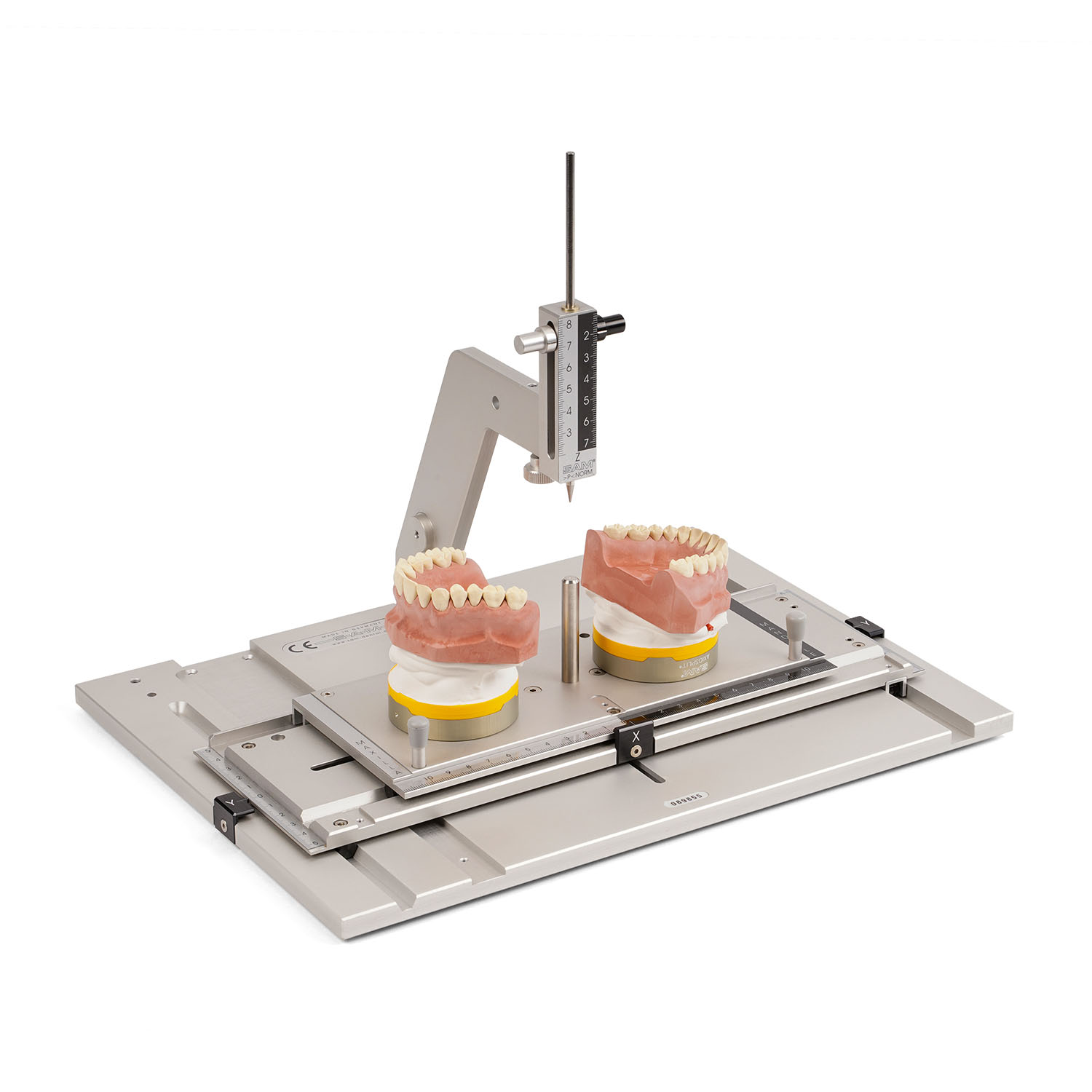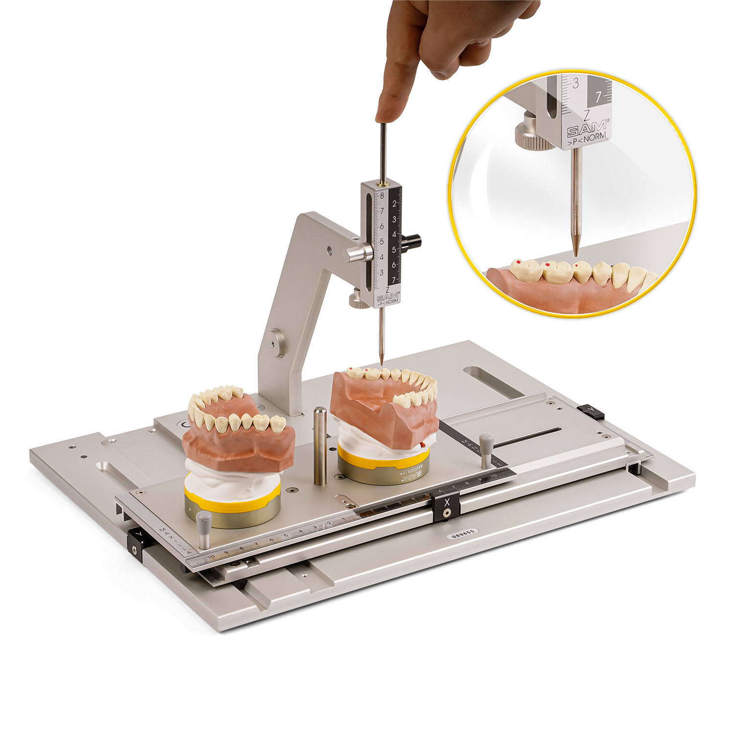 Прибор SAM RMI 500/550 позволяет проводить одновременное трёхмерное исследование смонтированных моделей верхней и нижней челюсти. Для сравнения соответствующих точек в области окклюзии или на гребне челюсти, для оптимизации положения опор имплантатов и документации. 3D-измерительный прибор доступен в механической версии (RMI500), а также с электронными штангенциркулями (RMI 550).