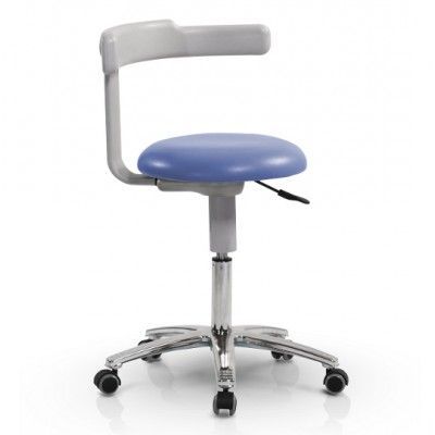 Стул ассистента имеет металлическое хромированное основание, пять колесиков, пластиковый абдоминальный упор, для комфортности работы. Регулируется высота сиденья.