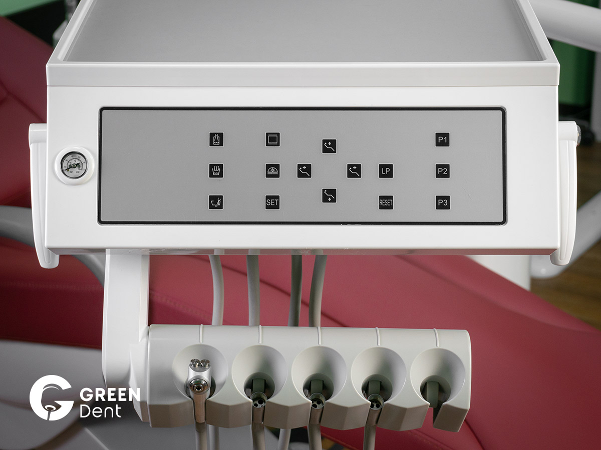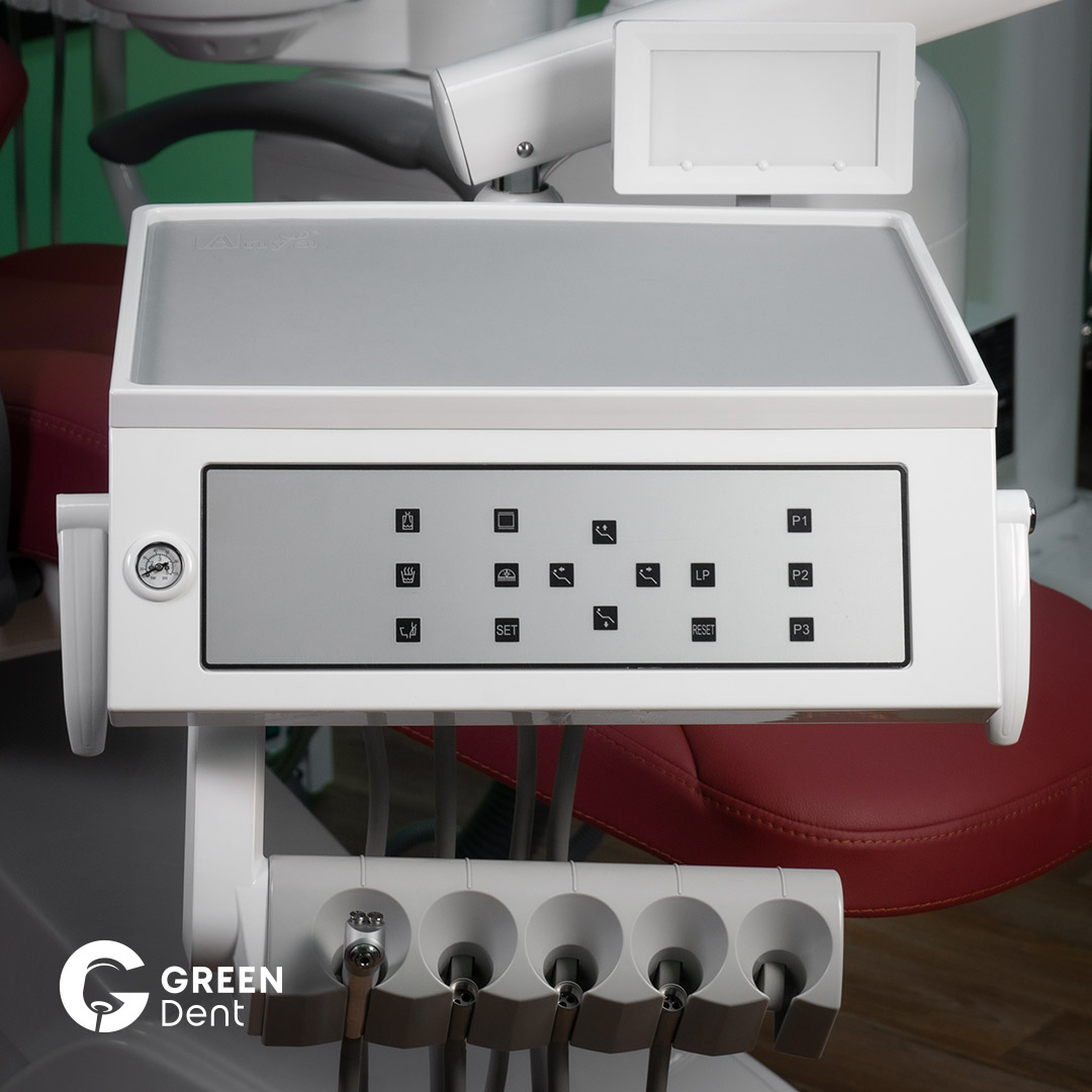 - Модуль ассистента на 4 инструмента с пылесосом и слюноотсосом, пистолетом вода/воздух и свободным местом, для полимеризационной лампы или интраоральной камеры.