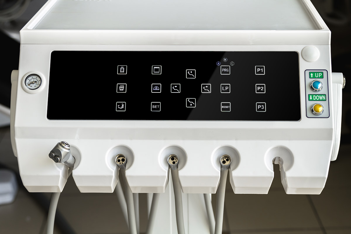 - Модуль ассистента на 4 инструмента с пылесосом и слюноотсосом (шланги с увеличенным просветом для использования с хирургической помпой), пистолетом вода-воздух и 4-м свободным местом для подключения полимеризационной лампы или интраоральной камеры.