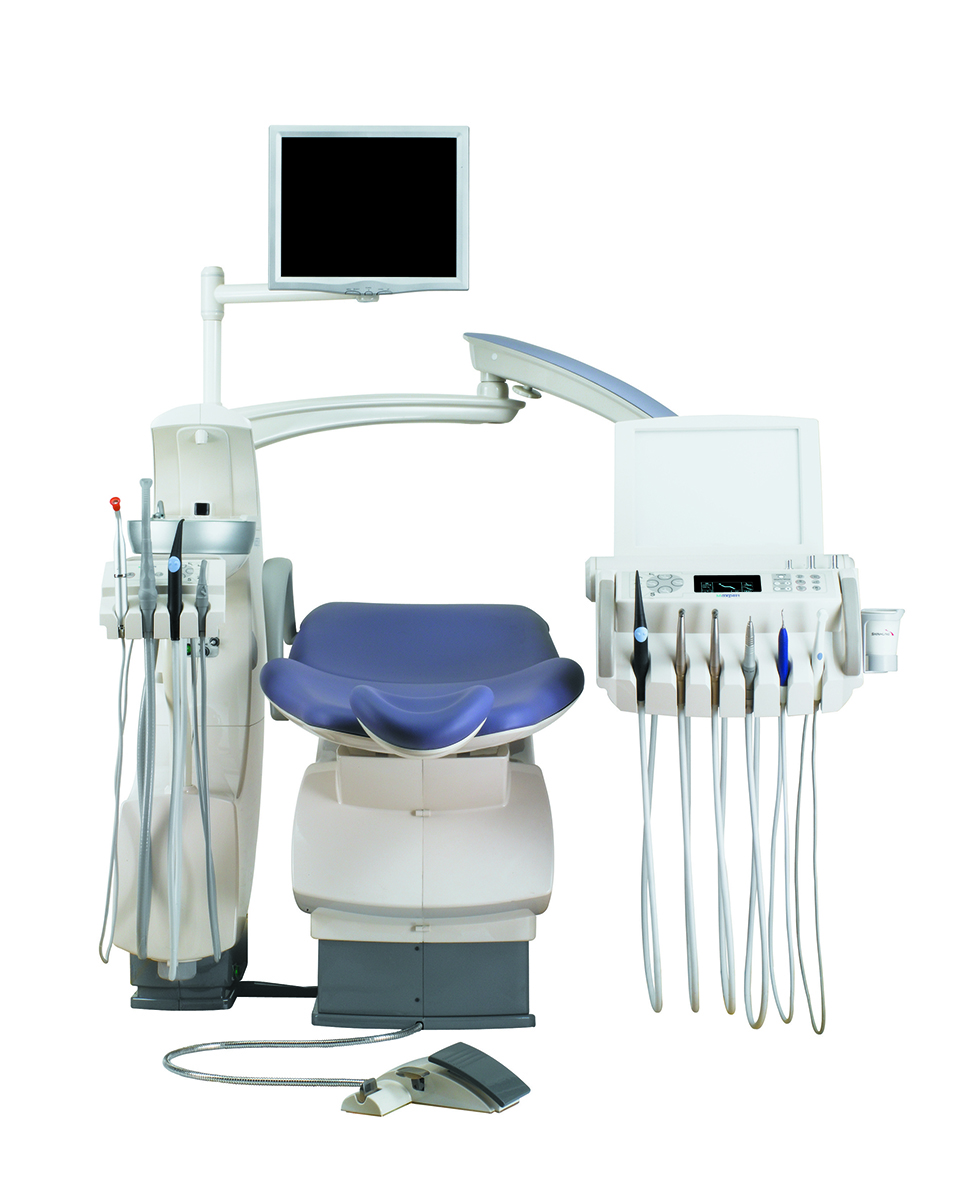 На блоке врача сенсорные кнопки управления. Большой 7-дюймовый ЖК-экран отображает информацию о положении кресла и настройках инструмента. Также на блоке врача расположен держатель на 6 инструментов.