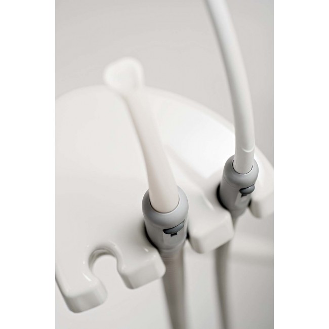 Модуль ассистента закреплён на двойном шарнирном манипуляторе. Для максимально эффективного взаимодействия врача и ассистента модуль оснащён 2 держателями (для хирургического пылесоса и слюноотсоса) и 1 держателем для дополнительного инструмента (второго шприца или светополимеризационной лампы). Панель управления легко очищается.