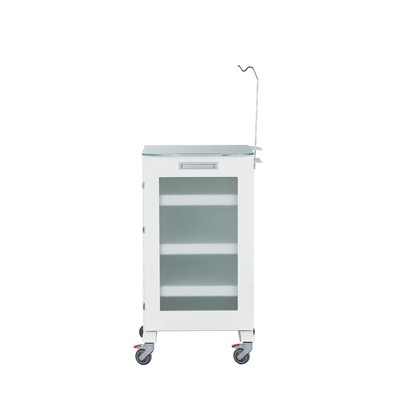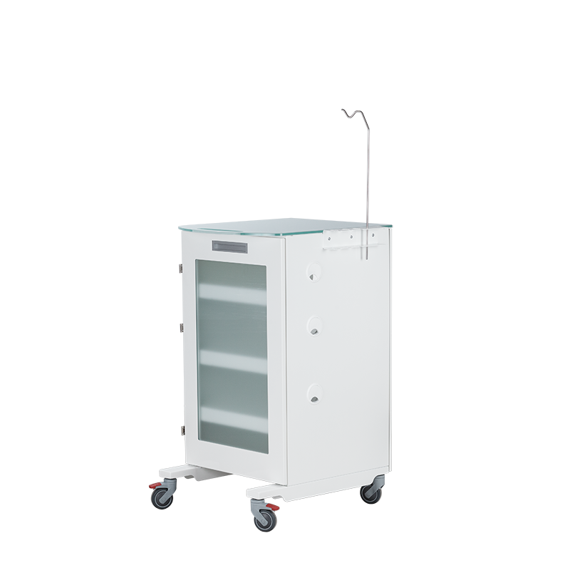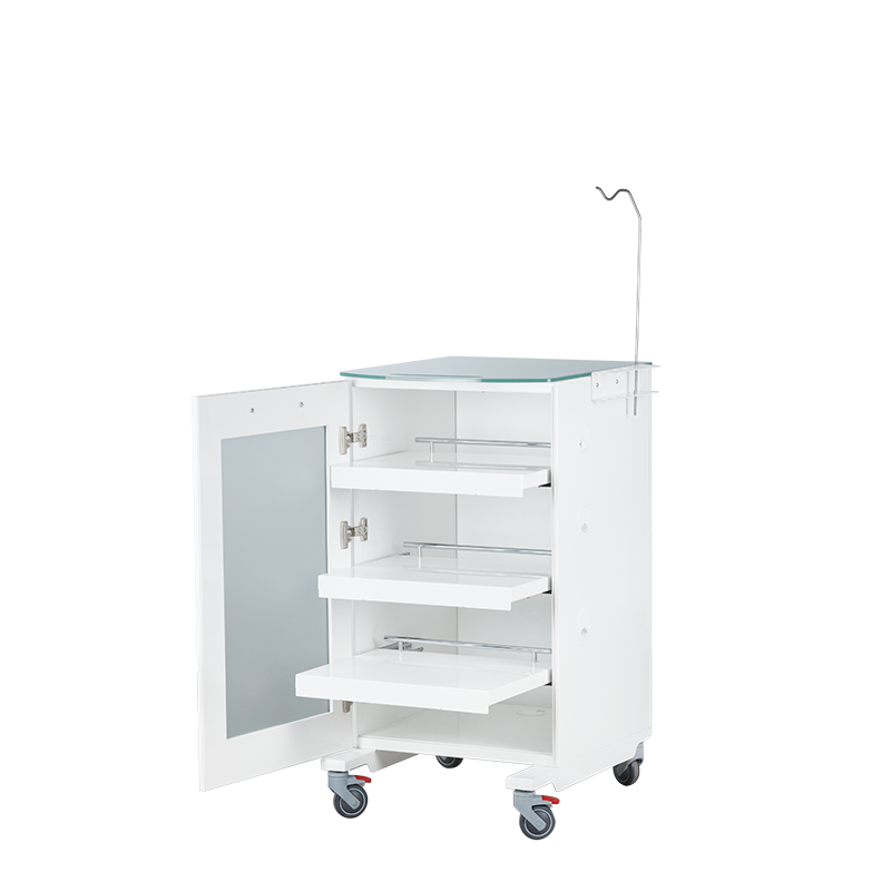 С тремя выдвижными полками. Столик оснащён специализированным держателем для стоматологических наконечников, а также штативом для крепления системы подачи физ.раствора. Столик установлен на колёса диаметром 75мм, два колеса с тормозом.