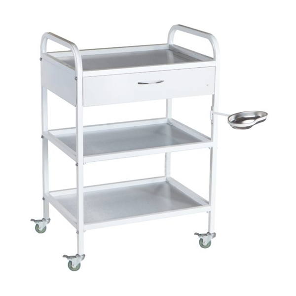 Каркас выполнен из профильной стальной трубы 20х20. Столик стандартно комплектуется пластиковыми колесами диаметром не менее 50мм*. Полки для этой модели изготавливаются из нержавеющей стали. В столике на ящиках применяются телескопические шариковые направляющие, ручки хромированы. Изделие поставляется в разобранном виде, что позволяет экономить средства при перевозке в другие регионы, однако, по желание заказчика, столик может поставляться и в собранном виде. Возможно изготовление полностью из нержавеющей стали. Комплектуется почкообразным лотком из нержавеющей стали на поворотном кронштейне.