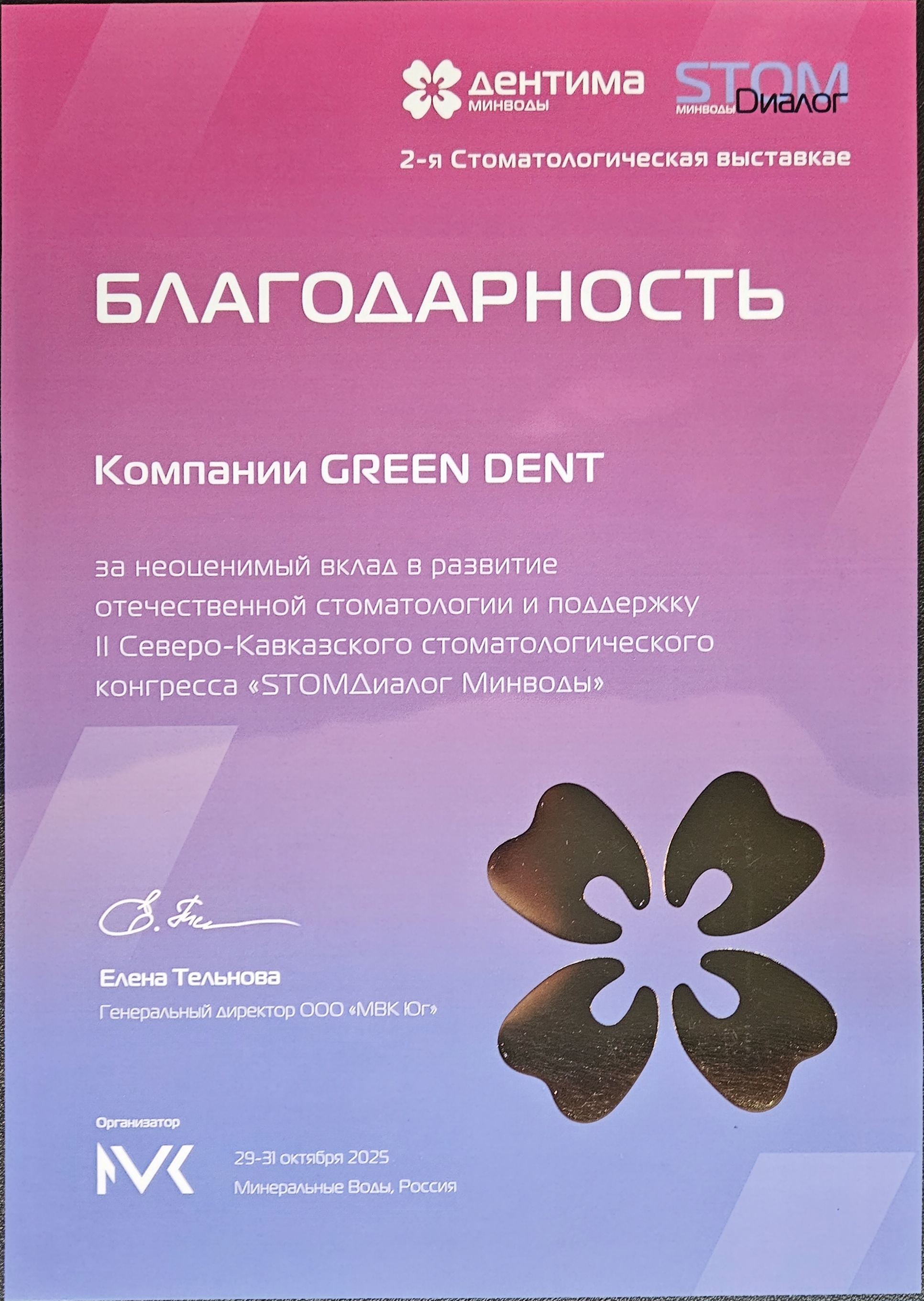 Компания MVK настоящим удостоверяет, что компания GREEN DENT являлась участником выставки «Дентима Краснодар» и была удостоена высокой оценки организатора за актуальность и профессионализм представленной экспозиции.