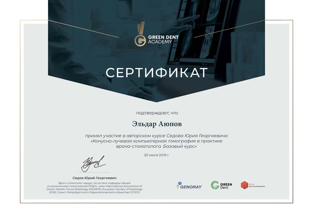 Сертификат подтверждает, что Эдьдар Аюпов принял участие в авторском курсе Седова Юрия Георгиевича «Конусно-лучевая компьютерная томография в практике врача-стоматолога. Базовый курс»